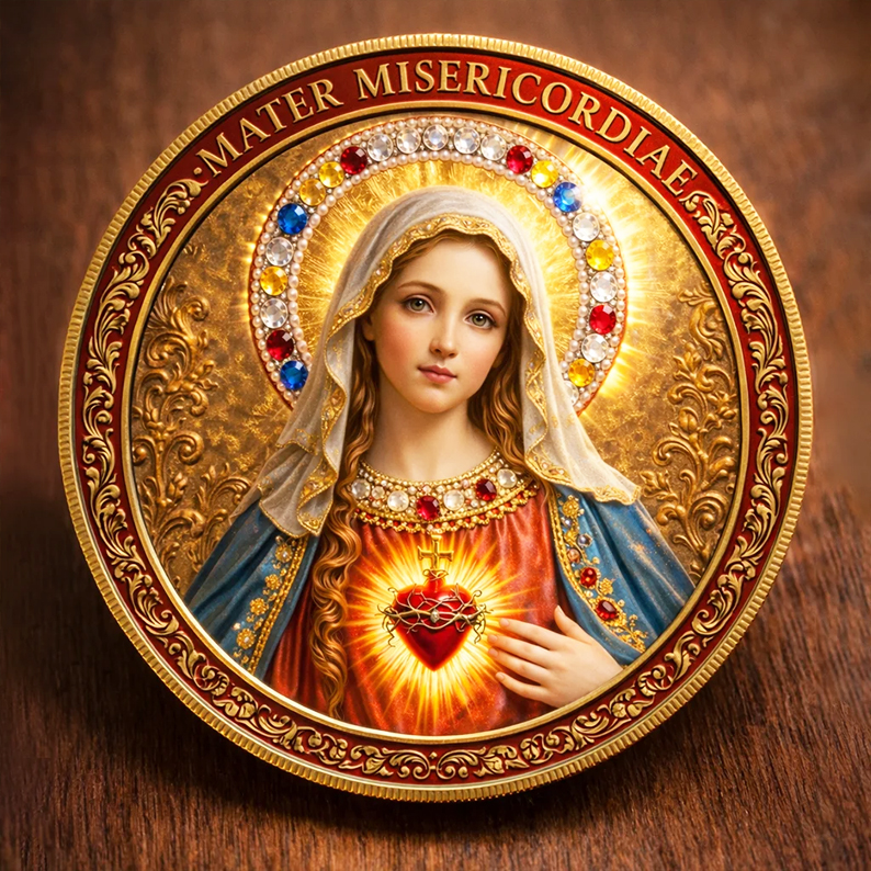 The front side features the Blessed Virgin Mary, crowned in light, with the Immaculate Heart radiant at her chest — encircled by jewels that symbolize faith, sacrifice, and divine grace.