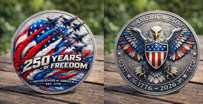 Encircling the eagle is the inscription “AMERICA 250”, with the commemorative dates 1776–2026 proudly displayed below, marking the nation’s historic milestone.
